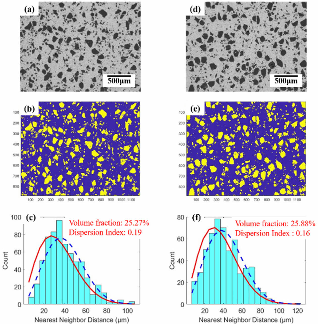 Fig. 5 (a), (d) SEM images of 20B4C+5cBN/Al1100 composite, (b), (e) extracted images of reinforcement, (c), (f) volume fraction of reinforcement and dispersion index |