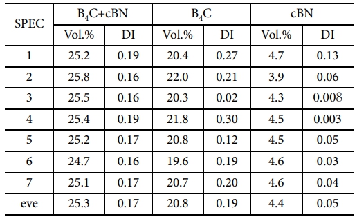 강화재의 분산도는 Dispersion Index(DI)로 표현할 수 있으며 0에 가까울수록 균일한 분산에 가까운 것을 의미하며 0.19, 0.16으로 강화재의 분산이 골고루 이루어진 것을 확인하였다. 또한, B4C와 cBN 강화재를 이미지에서 분리 추출하여 각각의 체적률과 분산도를 동일한 방법으로 분석하였다(Fig. 6). 분석한 전체 체적률 및 분산도와 B4C, cBN 각각의 체적률 및 분산도를 Table 1에 나타내었다. 총 7개의 SEM 이미지를 분석하였으며 두 강화재가 포함된 평균 체적률은 25.3%, 분산도는 0.17이며, B4C의 체적률과 분산도는 20.8%, 0.19이며 cBN의 체적률과 분산도는 4.4%, 0.05이다. 이를 통해 목표했던 강화재의 체적률과 유사하며, 다른 크기의 이종 세라믹 입자가 첨가되었음에도 알루미늄 기지내에 양호하게 분산된 건전한 복합소재가 제조되었음을 확인할 수 있다.