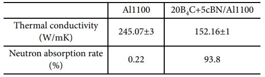 Table 2 Thermal conductivity and neutron absorption rate of Al1100 and 20B4C+5cBN/Al1100 composite |