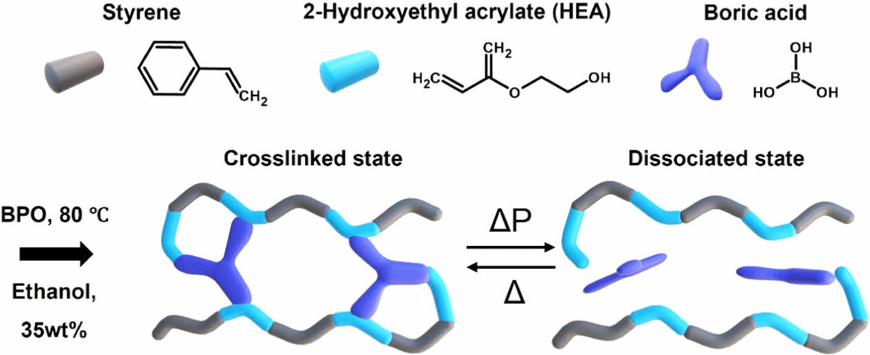 Fig. 1 Synthesis of boronic ester crosslinked network (BCN) and its proposed stress dissipation mechanism. The BCN is synthesized via the polymerization of styrene, 2- hydroxyethyl acrylate (HEA), and boric acid in ethanol (35 wt%) as the solvent, with benzoyl peroxide (BPO) as the thermal initiator at 80°C. The resulting material transitions between a crosslinked state and a dissociated state under applied pressure or temperature. The boric acid facilitates dynamic crosslinking, enabling the network to dissipate stress through reversible bond dissociation under shock loading (ΔP) |