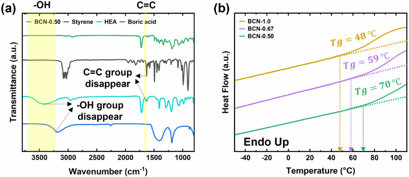 Fig. 2 Chemical and thermal properties of BCN polymers. (a) FTIR spectra illustrating the polymerization of BCN materials. The disappearance of the C=C bond peak at 1632 cm-1 confirms the successful polymerization of styrene and HEA. Additionally, the disappearance of the O–H group peak at 3400 cm-1~3500 cm-1 indicates the formation of boronic ester linkages through crosslinking between boric acid and hydroxyl groups in HEA. (b) Differential scanning calorimetry (DSC) analysis showing the glass transition temperatures (Tg) of BCN-1.0, BCN-0.67, and BCN-0.50, measured at 48°C, 59°C, and 70°C, respectively. The decreasing Tg values correspond to higher degrees of crosslinking density in the BCN formulations |