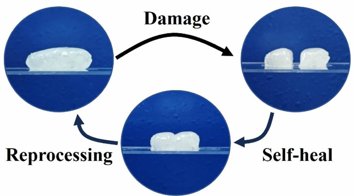 Fig. 3 Self-healing and reprocessing capabilities of BCN-1.0-gels. The BCN gels demonstrates excellent self-healing properties. After being damaged and split into two pieces, the material can self-heal by simply pressing the pieces together at room temperature (25°C) without the need for external stimuli. Once healed, the gels can undergo reprocessing under mild pressure, reshaping it into its original form |