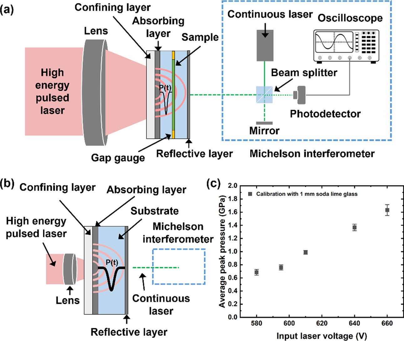 Fig. 4 Schematics of the laser-induced shockwave test and calibration setup. (a) The apparatus for laser-induced shockwave testing includes a high-energy pulsed laser, a confining layer, absorbing layer, and a sandwich-structured specimen with a reflective layer for measuring pressure dissipation. The Michelson interferometer is used to capture shockwave signals with a continuous laser setup, interfacing with an oscilloscope. (b) Calibration test setup with a single substrate specimen to measure input shockwave pressure. (c) Calibration results showing average peak pressure as a function of input laser voltage, using a 1 mm soda lime glass substrate for reference. The data illustrate the relationship between input laser voltage and average peak pressure in the calibration tests |