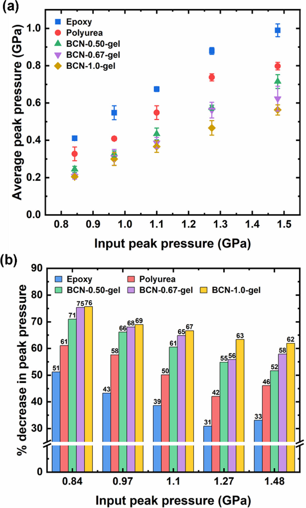 Fig. 5 High strain rate stress wave dissipation performance of BCN gels. (a) Average peak pressure as a function of input peak pressure for epoxy, polyurea, and BCN gels. BCN gels with higher crosslinking density (BCN-1.0-gel) demonstrate lower average peak pressures, corresponding to enhanced pressure dissipation capability. (b) Percentage decrease in peak pressure relative to input peak pressure for the different materials. BCN gels, particularly those with higher crosslinking density, show superior performance, with a greater percentage decrease in peak pressure compared to epoxy and polyurea |
