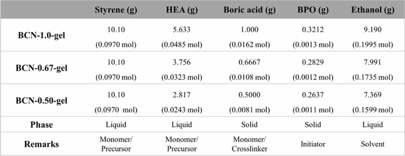 A preparation procedure for BCN-X-gel is to mix Styrene, HEA, and Boric acid into a round-bottom flask equipped with a magnetic stirring bar. The mass of each component is shown in Table 1. Subsequently, Ethanol was added to the flask, and the mixture was stirred for 5 minutes. Afterward, BPO (2 wt%) was introduced into the flask and stirred for 12 hours at 80°C. When the reaction is complete, the solvent is evaporated under vacuum to give the polymer (BCN-X). An excess of ethanol was added to the polymer and stirred at 50°C for 12 hours. Excluding the precipitated material, the remaining ethanol was separated to give BCN-X-gels containing 35 wt% ethanol. For the measurements of shockwave pressure dissipation, a 20 mg piece of cured BCN-gels was placed onto a 400 nm thick aluminum deposited glass substrate. A 50 μm polyimide spacer was used to maintain the thickness of the BCN-gel film. A second glass substrate, coated with a 400 nm thick layer, was then placed on top, sandwiching the film between the two glass substrates using with a gentle pressure for an hour at room temperature, 25°C. BCN-gel specimen was prepared without increasing temperature. Water glass Na₂SiO₃ layer was spun cast with 1500 rpm for 45 seconds before conducting the test.