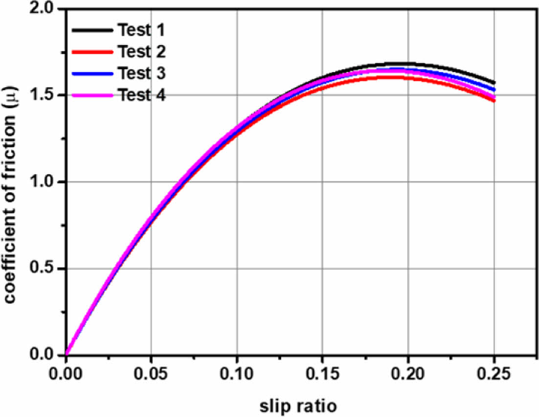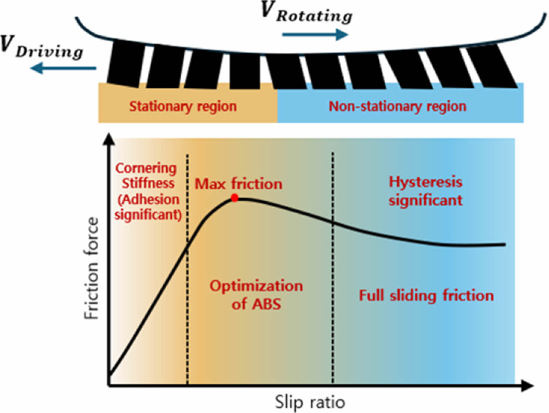 그럼에도 불구하고 구름마찰 시험은 미끄럼마찰 시험과 달리 1회 평가를 통해 Fig. 2와 같이 타이어 마찰에서 중요한 Anti-lock Brake System (ABS) 영역[9,10]의 슬립율(Slip Ratio)까지의 마찰특성을 확보할 수 있기 때문에 산업계에서 널리 사용되고 있다. 따라서 구름마찰 시험의 장점을 활용하여 보다 정확한 타이어 마찰 분석을 위해서 고속에서의 구름마찰특성을 예측할 수 있는 방법 및 마찰시험 결과를 마찰이론에 따라 세부적으로 분석하는 방법이 필요하다.