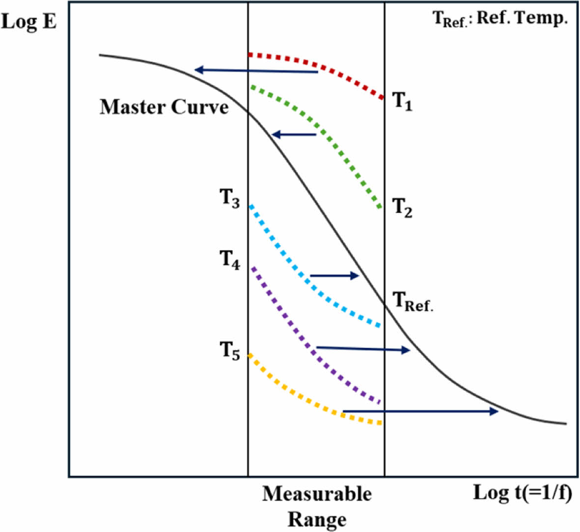 마찰 마스터커브는 고무재료 물성인 점탄성과 미끄럼마찰거동 간의 관계를 통해 구축되는 마스터커브이다. 이는 고분자 재료의 물성을 해석하기 위해 일반적으로 사용하는 시간-온도 중첩의 원리를 마찰에 적용한 개념이다. 시간-온도 중첩의 원리는 Fig. 3과 같이 점탄성 재료의 온도변화를 기반으로 주파수에 따른 기계적 거동을 예측하는 방법이다[18]. 여기서 E는 점탄성 모듈러스, Tn은 온도, TRef.는 기준온도(Reference temperature), t는 시간, f는 주파수를 나타낸다.