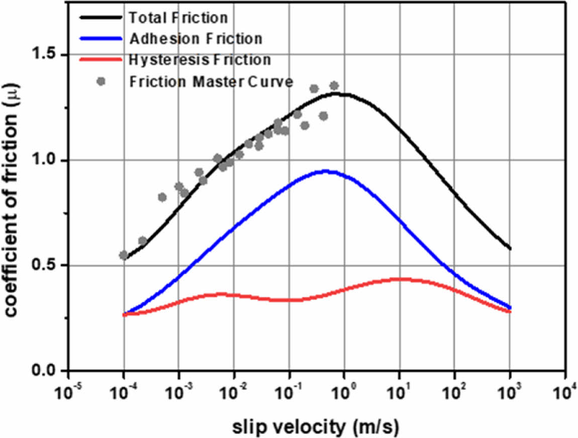 Klüppel & Heinrich[11]는 고분자 분야에서 주로 사용하는 시간-온도 중첩의 원리를 미끄럼마찰 시험을 통해 확보한 마찰특성에 적용하여 광범위한 슬립속도에서의 마찰특성을 예측하는 마찰 마스터커브를 구축하였고, 이를 통해 슬립속도에 따라 달라지는 고무마찰 메커니즘의 기여도를 정략적으로 분석할 수 있는 마찰이론을 정립하였다.