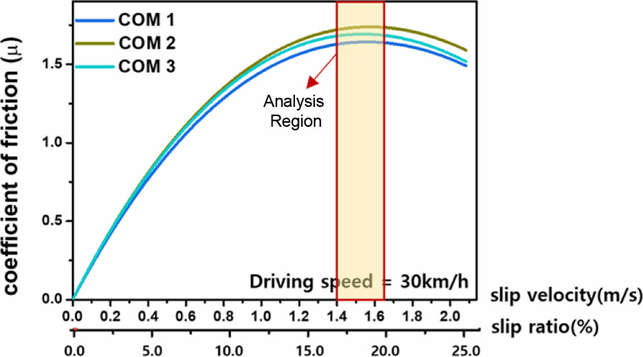 결과적으로 Fig. 4와 같이 실험적으로 얻은 마찰 마스터커브에서 2.5 m/s의 속도까지 각 트레드 컴파운드의 마찰특성을 확인할 수 있었고 마찰이 선형적으로 증가하는 모습을 확인할 수 있었다.