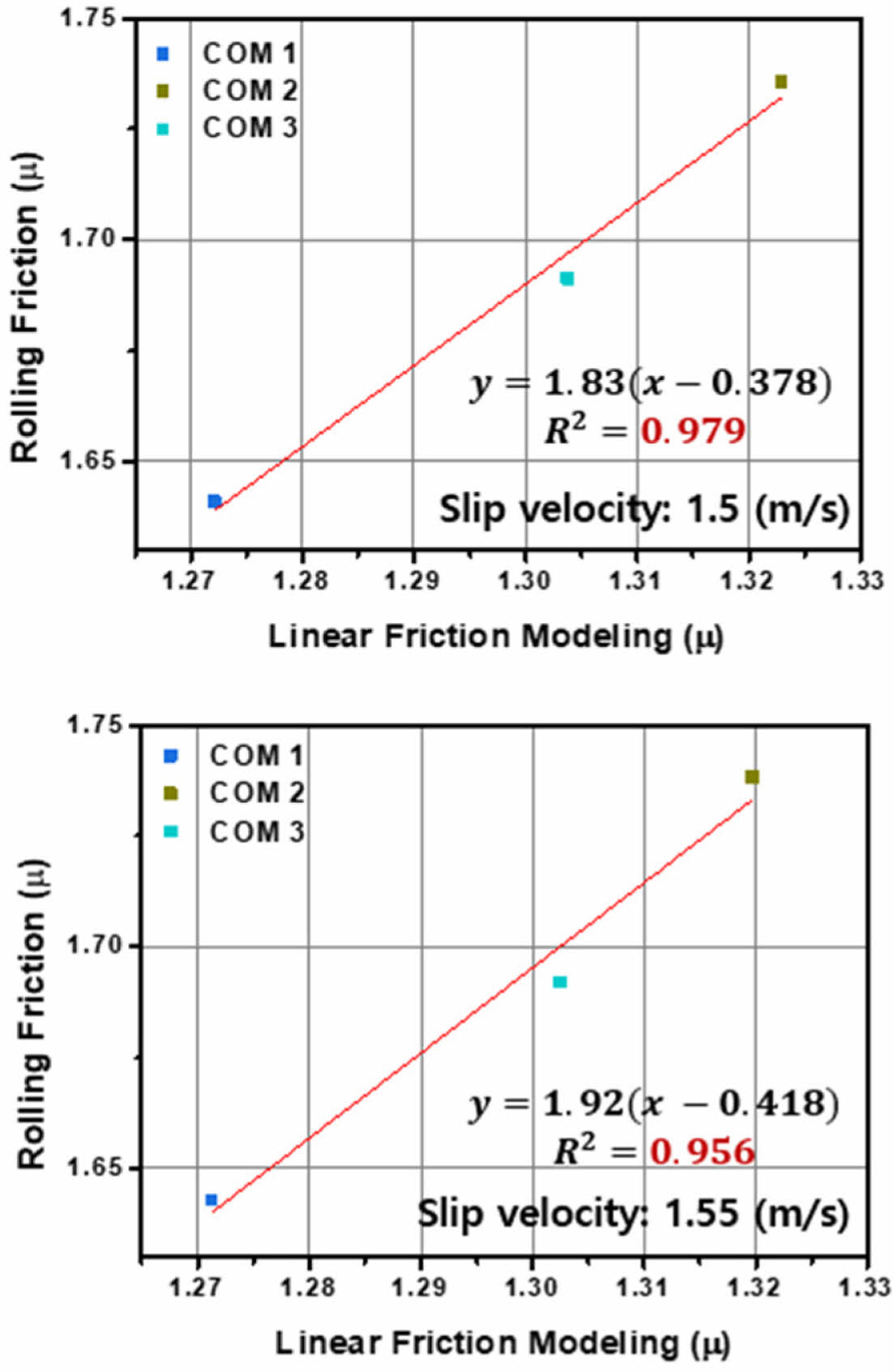 본 연구에 적용된 3 종류의 트레드 컴파운드 최대값 영역은 Table 1과 같이 16.8~19.8%에서 형성되었다. 이를 마찰이론 모델링 결과와 비교하기 위해 주행속도 30 km/h에 각 해당 슬립율을 곱하여 슬립속도로 변환하였고, 분석범위 내의 미끄럼 및 구름마찰의 상관관계를 분석하였다. 분석기준은 선형 회귀 모델을 적용하여 상관관계식을 도출하고 그에 따른 결정계수를 통해 상관관계를 분석하였다.