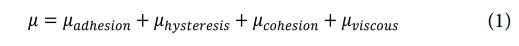 고무마찰 메커니즘은 고무와 노면 간의 발생하는 마찰을 식 (1)과 같이 점착(Adhesion) 마찰, 히스테리시스(Hysteresis) 마찰, 응착(Cohesion) 마찰, 점성(Viscous) 마찰의 4가지 요소로 구분한다.