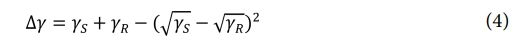 점착마찰을 정의할 때 필요한 실계면전단강도는 접착 일 (Work of adhesion, ∆γ)을 통해 계산된다[18]. ∆γ는 식 (4)와 같이 두 고체가 접촉할 때 단위 면적당 계면 자유 에너지의 변화이다. 여기서 γS, γR는 각각 사포노면과 트레드 컴파운드의 표면에너지를 나타낸다. 따라서 DSA-25(KRUSS, Germany) 장비를 활용하여 트레드 컴파운드와 사포노면의 접촉각 측정을 통해 표면 에너지를 계산하였고 두 표면 간의 발생하는 접착 일을 계산하였다.