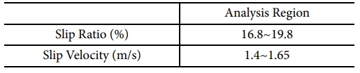 마찰이론 모델링 결과와 구름마찰 시험결과를 통해 두 마찰 간의 상관관계를 분석하였다. 상관관계 분석범위는 Fig. 6와 같이 타이어 제동성능 분석에 가장 큰 영향을 미치는 구름마찰 시험결과의 최대값 영역을 선정하였다. 이는 차량의 ABS 성능을 분석하는데 주로 활용되는 영역이다.