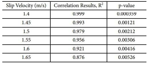 추가적으로 상관관계 결과에 대한 신뢰성을 높이기 위해 F-통계량에 따른 p-value를 분석하였다. F-통계량은 선형 회귀 모델의 통계적 유의성을 검정하는 데 사용되는 지표이며, 이에 따른 p-value를 통해 유의성을 분석한다. 일반적으로 p-value가 0.05 이하인 경우 높은 통계적 유의성을 가진다고 판단하는데, 본 연구에서는 분석범위 내 슬립속도에서 상관관계식의 p-value가 0.01이하로 매우 높은 통계적 유의성을 가지고 있음을 확인할 수 있다.