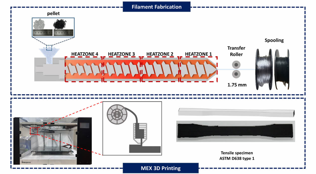 Keywords: 재료 압출(Material extrusion), 재활용 탄소 섬유(Recycle carbon fiber), 복합재(Composite), 기계적 (Mechanical properties), 형태학적 특성(Morphological characteristics)