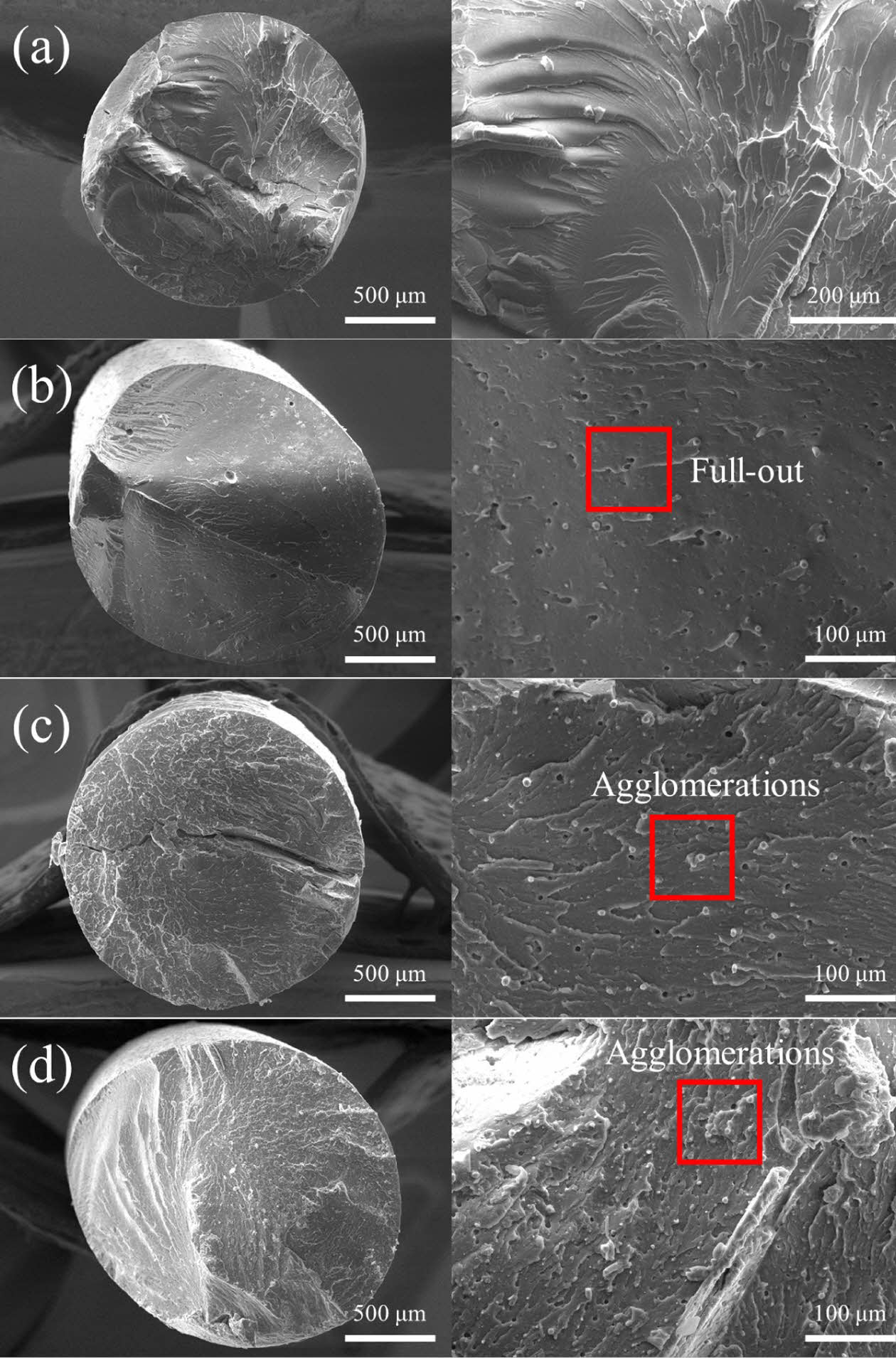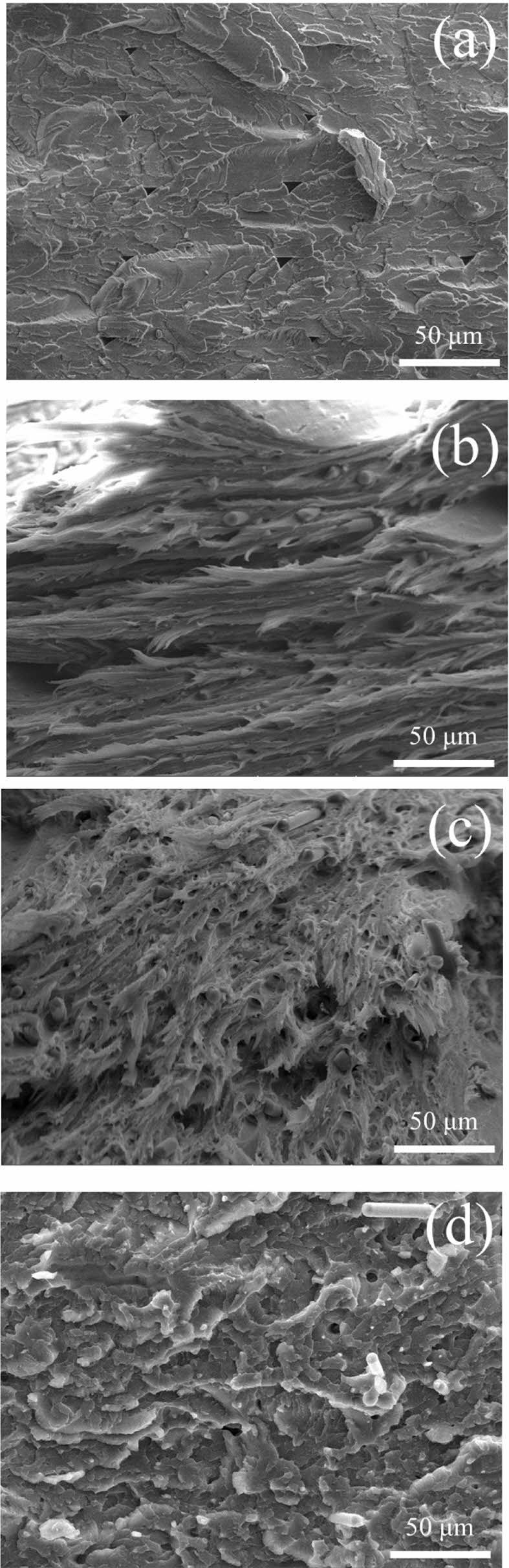 Fig. 7 The SEM fracture interface of the specimens with and without carbon fibers after Tensile testing : (a) PETG, (b) PETG/5 %rCF, (c) PETG/10 %rCF, and (d) PETG/15 %rCF |