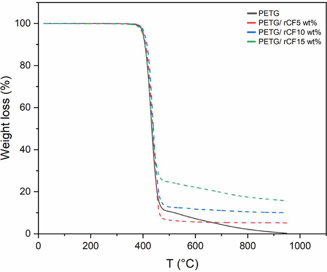 Fig. 5 TGA results of PETG, rCF-PETG |