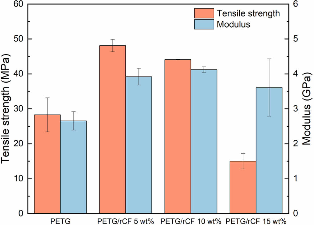 Fig. 6 Tensile testing of Pure PETG and PETG/rCF composites |
