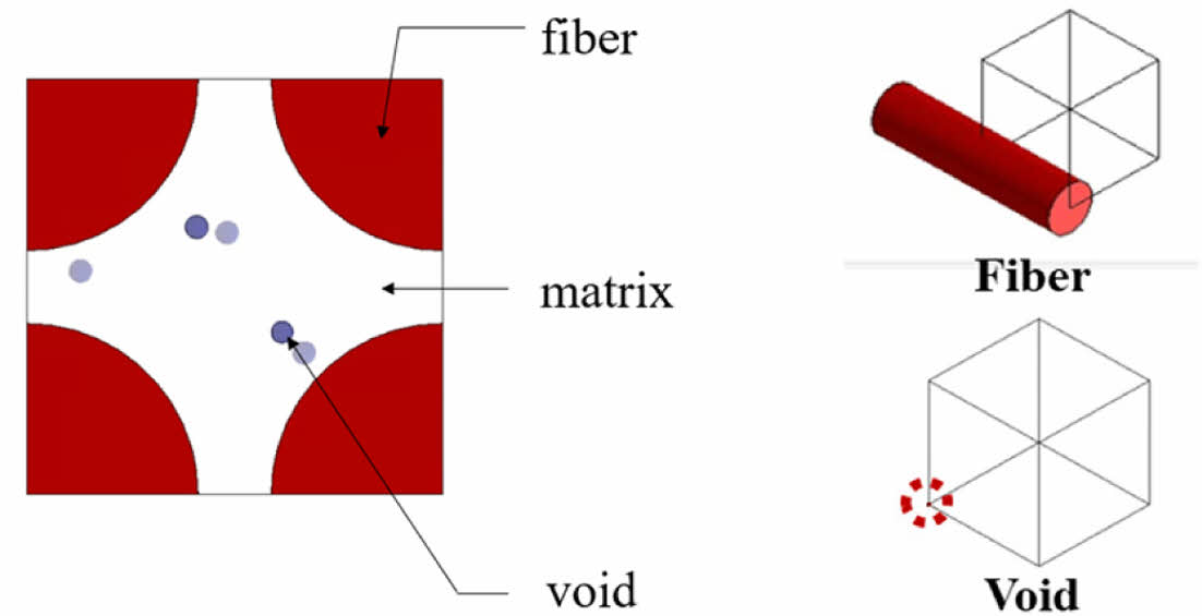 이 수식은 RVE의 부피 내에서 응력과 변형률의 평균 값을 나타내며, 이를 통해 거시적 관점에서 복합재의 물성을 산정할 수 있다. 전통적인 해석법은 복합재의 특성을 보수적으로 예측하는 경향이 있는 반면, RVE 기반 해석은 섬유함유율, 기공률, 섬유 형태 등 다양한 미시구조 변수를 반영하여 보다 정밀한 물성 예측이 가능하다. Fig. 1은 RVE 모델을 통해 복합재 내 섬유, 수지(매트릭스), 기공의 분포를 나타내었다. 본 연구에서는 RVE 기반 해석을 통해 산정된 물성치를 UAM 붐 구조 설계에 적용함으로써 경량화와 구조적 안정성을 입증하였다.