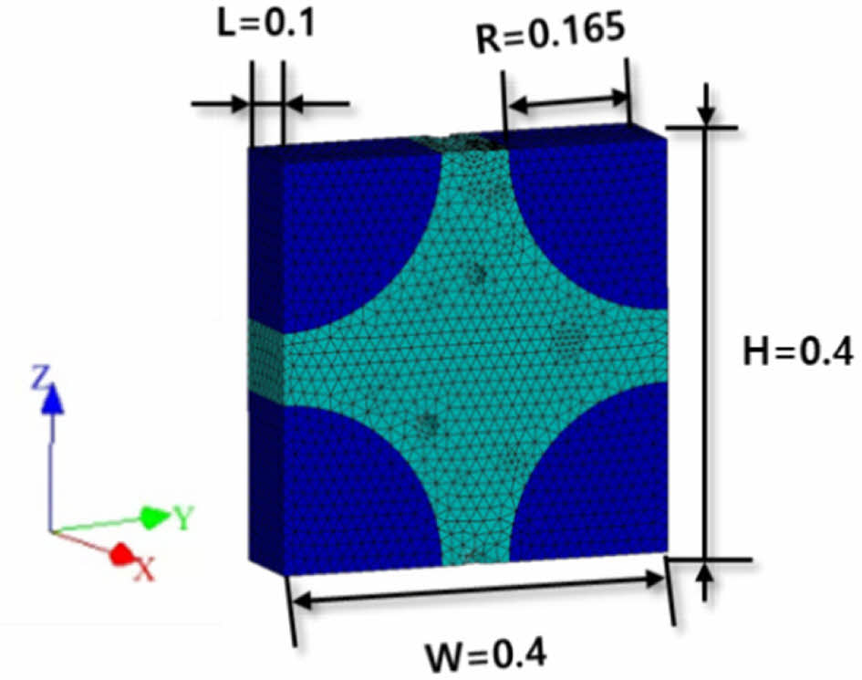 Fig. 2 Geometric dimensions and meshing of three-unit cells in a fiber bundle |