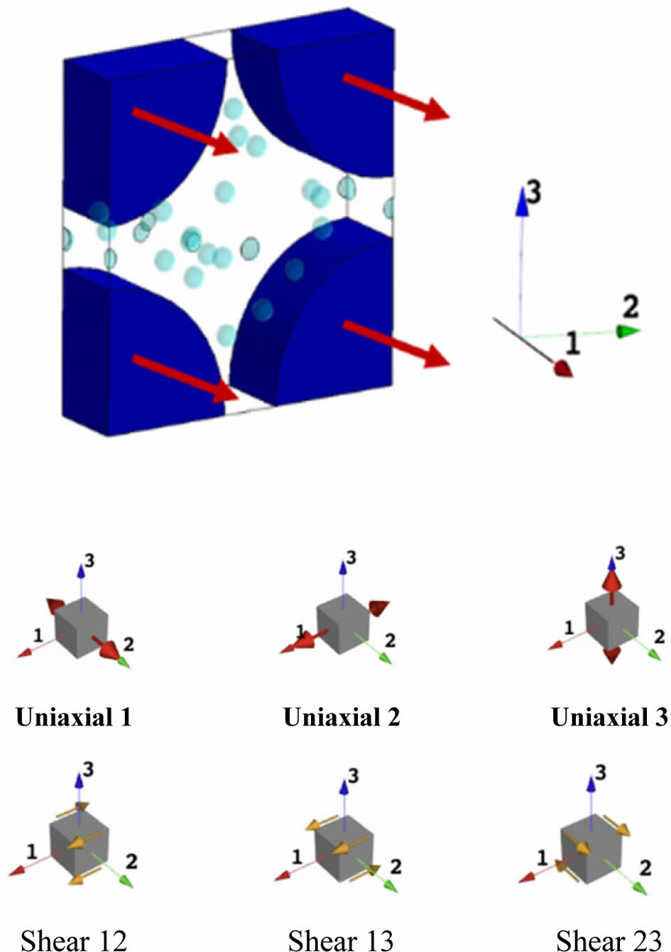 Fig. 3에서와 같이 각 방향의 경계 조건을 설정하여 1, 2, 3 방향에 대한 축방향(uniaxial)과 전단(shear) 강성을 도출하였다. 경계 조건은 RVE 모델의 각 면에 대해 적절히 적용되었으며, 이는 각 방향에서 발생하는 응력과 변형률 반응을 체계적으로 분석하기 위한 것이다. 축방향 하중은 각 방향(1, 2, 3)에 대해 독립적으로 적용되어, 각 축에 대한 강성을 평가하고 복합재의 축방향 물성을 파악하였다. 전단 하중은 12, 13, 23 방향으로 설정되어 각 면에서 발생하는 복합적인 전단 반응을 측정하고 해석하였다. 이러한 경계 조건의 설정은 RVE 해석 시 복합재의 기계적 성질을 더욱 정확히 평가할 수 있도록 하며, 다양한 하중 조건 하에서 복합재의 응답 특성을 반영할 수 있도록 설계되었다. 이를 통해 기공, 섬유 배향 등 미시 구조 요소가 각 방향의 강성에 미치는 영향을 세부적으로 분석할 수 있었다.