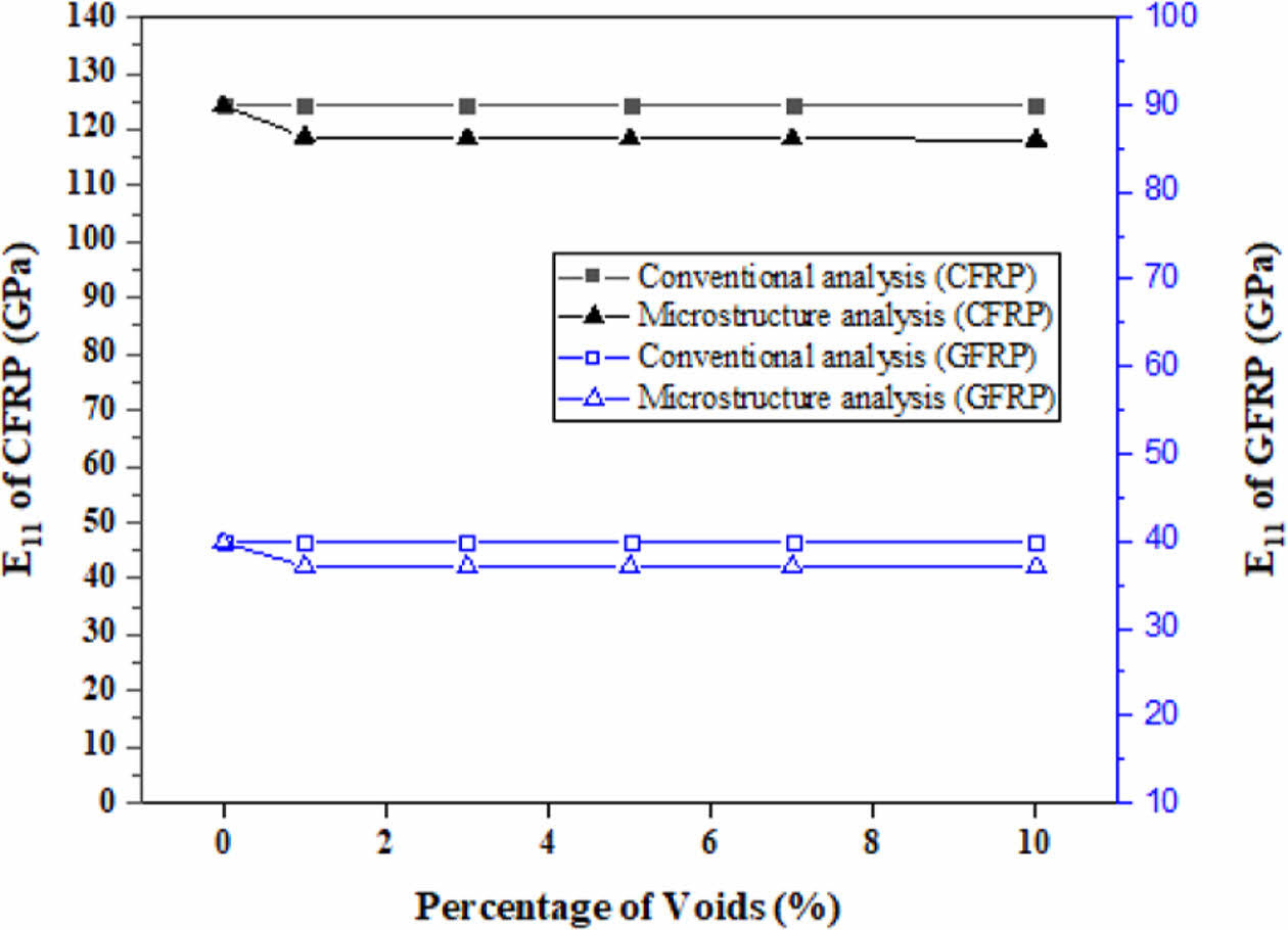 Fig. 4 Longitudinal modulus comparison of CFRP and GFRP with void content (Conventional vs. Microstructure analysis) |
