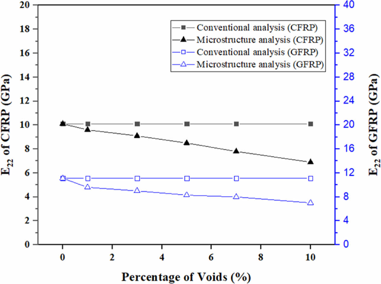 Fig. 5 Transverse modulus comparison of CFRP and GFRP with void content (Conventional vs. Microstructure analysis) |