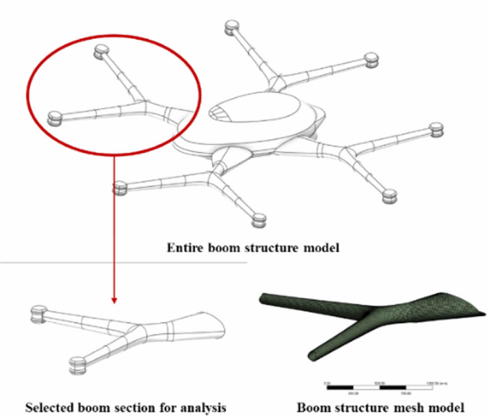 ③ UAM 붐 구조 설계 및 해석 – ②를 통해 도출된 구조설계 물성치를 활용하여 UAM 붐 구조해석에 적용하여 구조해석 결과 도출