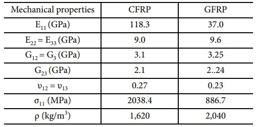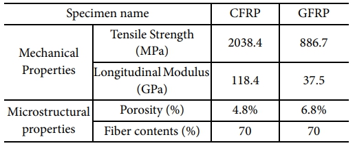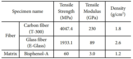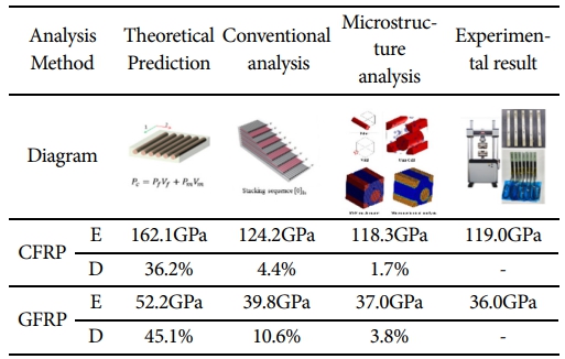 RVE 해석을 바탕으로 CFRP 및 GFRP의 기계적 물성치를 도출하였다. 산정된 탄성계수, 인장강도 등의 값은 실제 실험값과의 비교를 통해 실제 실험값과 5% 이내의 신뢰성 있는 물성치가 도출되었다. 도출된 물성치는 Table 4에 정리되었으며, 기존 이론값들과 비교해 높은 정확도를 나타냈다.