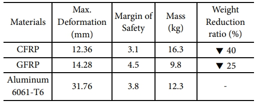 (3) UAM 붐 구조에 CFRP와 GFRP를 적용한 결과, 알루미늄 합금 대비 각각 40%와 25%의 무게 절감 효과가 확인되었다. 또한, 두 복합재는 알루미늄 합금보다 높은 안전계수를 유지하며 충분한 구조적 안정성을 제공하여 FRP가 경량화와 고강도를 동시에 충족할 수 있음을 입증하였다. 이러한 결과는 경량화와 고강도가 동시에 요구되는 UAM 설계에서 FRP 재료가 더 나은 운송 효율을 제공할 수 있음을 나타낸다. 특히, 전기 추진 시스템에서의 경량화는 에너지 효율을 극대화하는 데 기여할 것으로 판단된다.