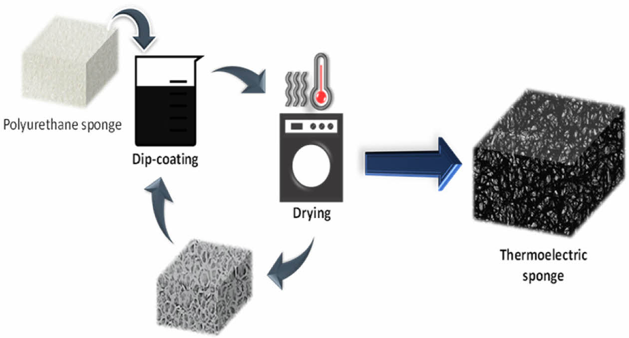 반면, 유기 열전 물질에 대한 연구의 대부분은 필름 타입인데 필름은 구조적으로 반복된 인장/압축에 취약할 수밖에 없다. 따라서, 3D 다공성 벌크 타입의 열전 물질에 대한 연구가 진행되었다[16-20]. 즉, 벌크 형태의 다공성 스펀지를 적용하여 필름의 낮은 내구성을 극복하고, 스펀지의 낮은 전기전도성은 전도성 필러로 보완할 수 있다.