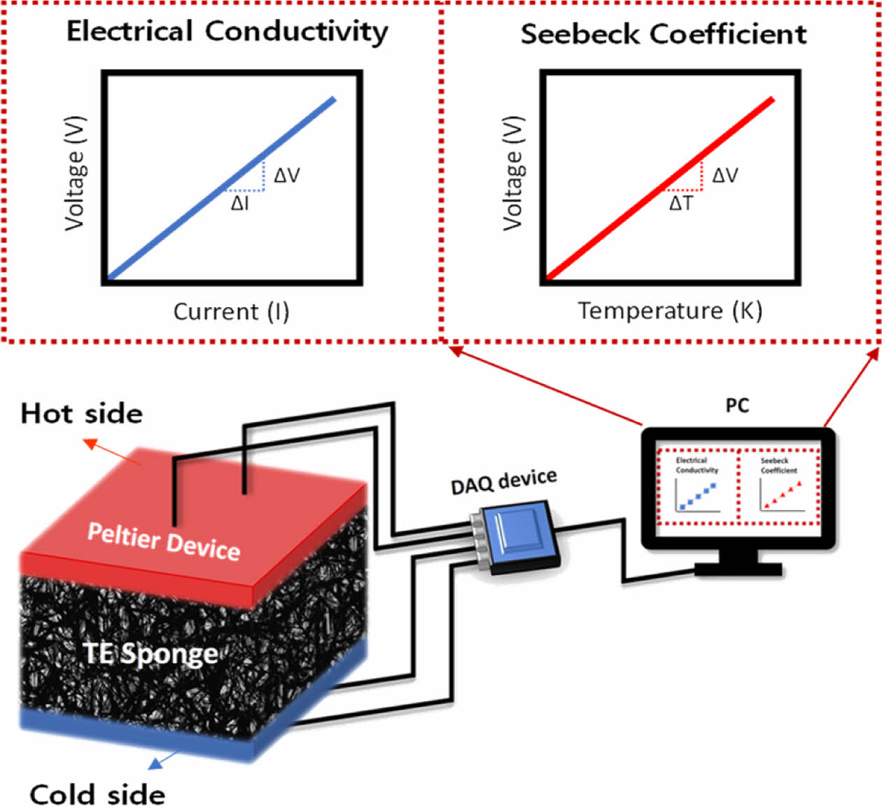 평면 외 방향으로 전기전도도와 제벡계수를 측정하기 위해, Fig. 2와 같이 자체 제작한 장비를 사용하여 시편의 열전 특성을 분석했다[21]. 와이어와 열전대(k-type)를 상·하단에 2개씩 배치하여, 4-프로브 방식으로 시편의 전기 저항을 측정했다. 제벡계수 측정에 필요한 온도 구배를 주고, 측정 신뢰도를 저해하는 시편과 열전대 사이의 콜드 핑거 효과를 최소화하도록[22] 상용 열전 모듈(Center Hall Thermoelectric module, 20045/125/060B, Ferrotec)을 사용했다. 자체 제작한 장비로 측정한 스펀지 시편의 제벡 계수가 동일 농도의 유기 열전 잉크로 제작한 필름의 제벡계수와 거의 동일함을 확인했으며, 이를 통해 장비의 신뢰성을 입증했다.