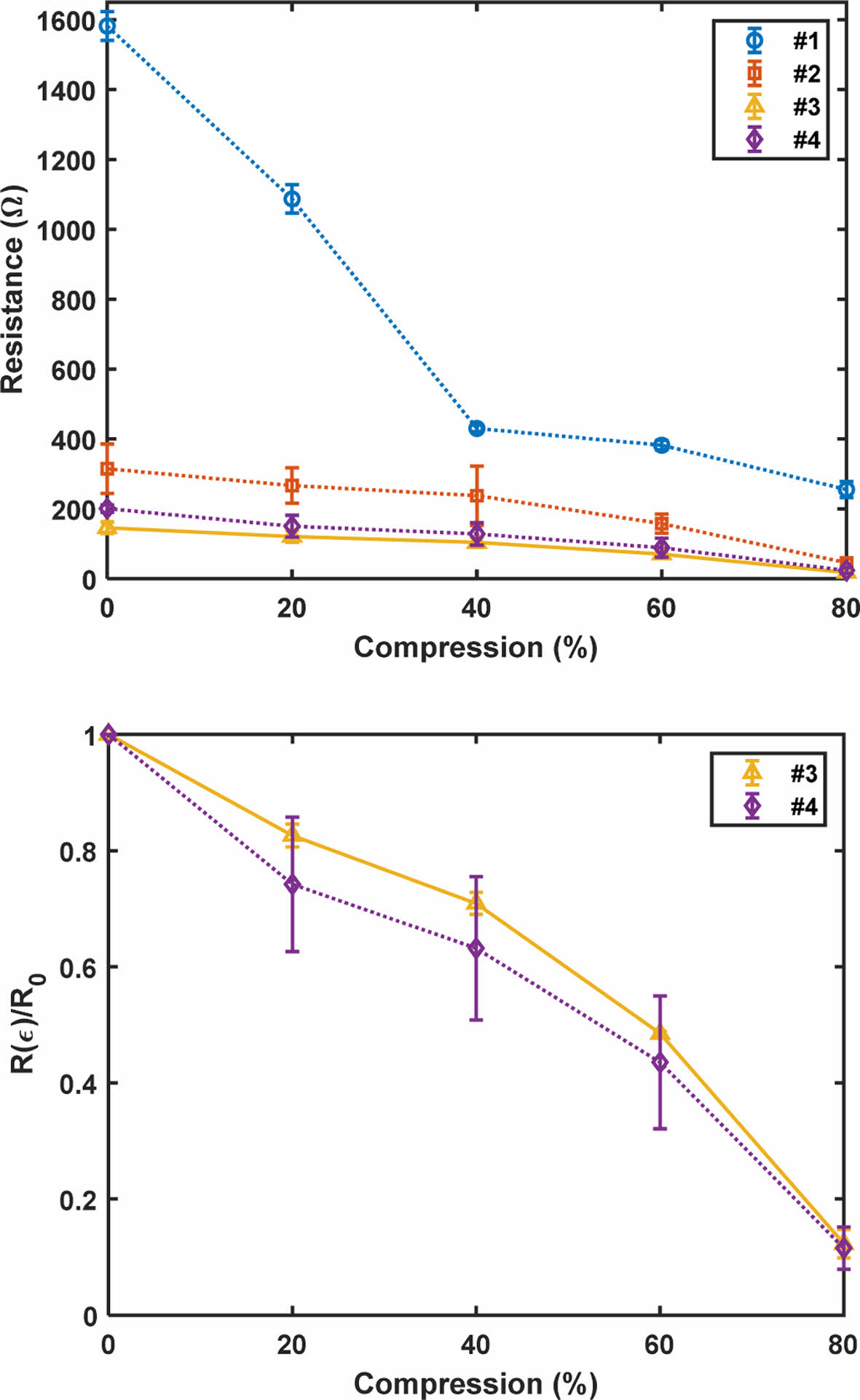 Fig. 3 Electrical resistance (upper) and the ratio of resistance change(lower) upon compression conditions |
