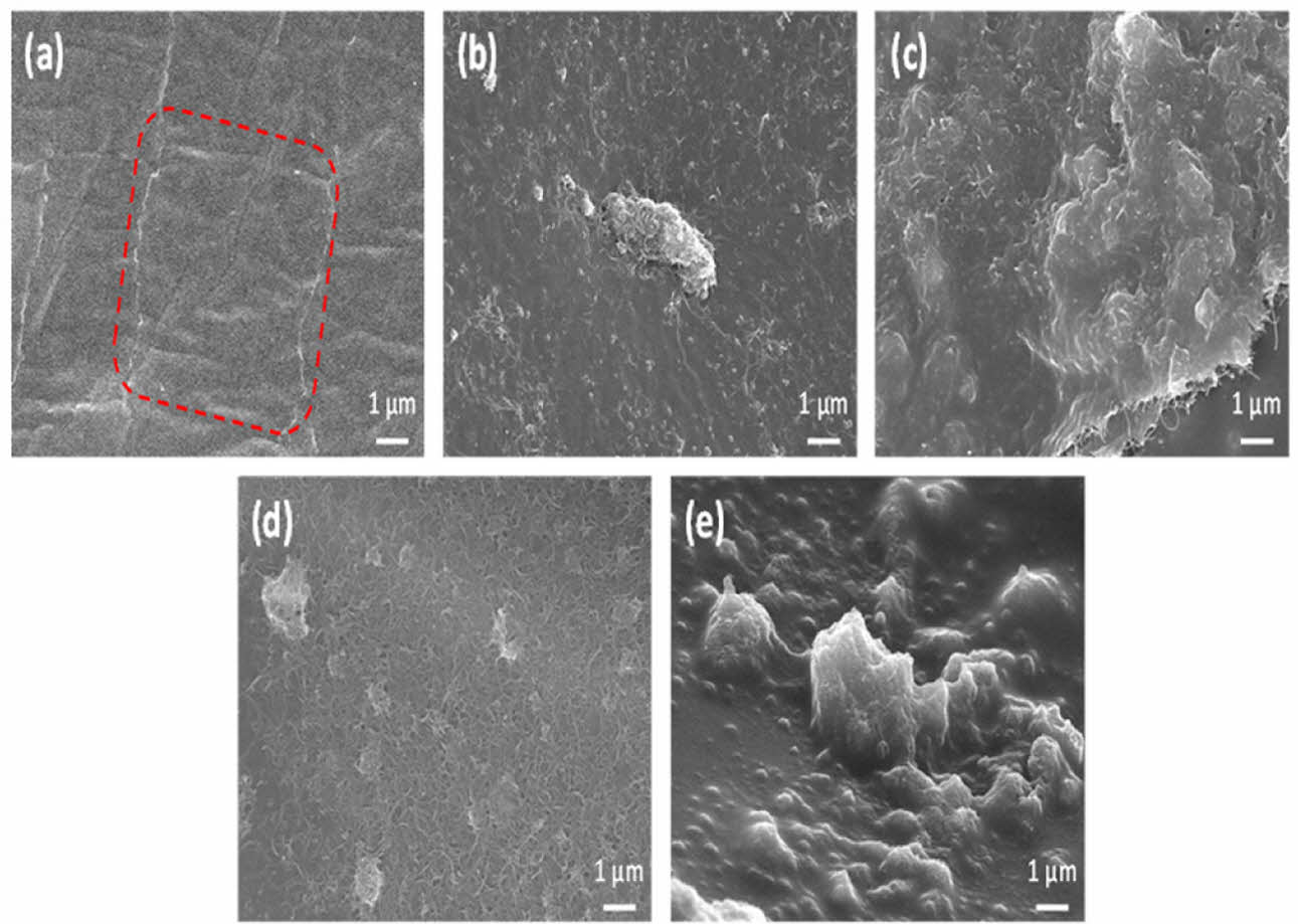 Fig. 4 Specimen surface SEM images: (a) pristine, (b)-(e) #1-#4, respectively. All scale bars indicate 1 μm |