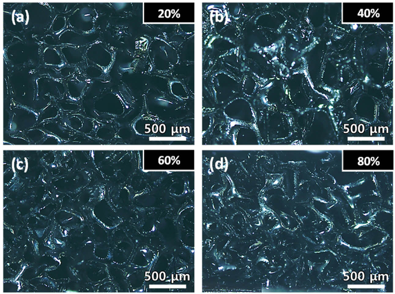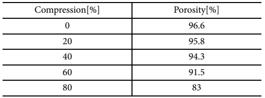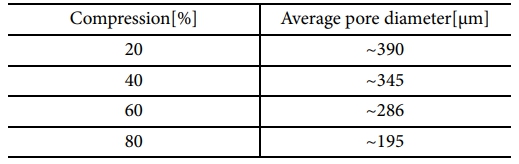 Fig. 5는 압축 조건 별 시편 기공의 광학현미경 사진을 보여준다. 20~60%까지는 기공 평균 직경이 거의 일정한 것으로 보이지만, 80%에서는 큰 차이가 있는 것을 확인할 수 있었다. Table 3은 압축 조건 별 기공 평균 직경을 나타낸 것으로, 80%(~195 μm)에서 20%(~390 μm)보다 평균 직경이 50% 감소한 것을 확인할 수 있다.