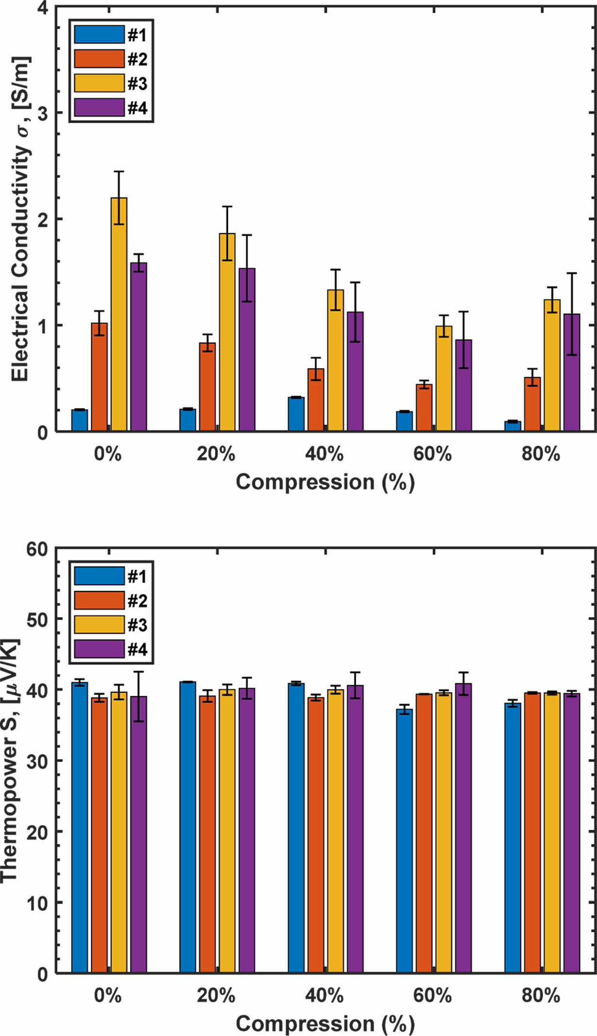 Fig. 6은 압축에 따른 각 시편의 열전 특성을 나타낸다. #1의 전기전도도는 Fig. 4에서 확인했듯이 코팅이 균일하지 않아 나머지 시편들과는 다른 경향성을 가지는 것을 알 수 있다. 60%까지 압축했을 때, #1을 제외한 모든 시편의 전기전도도는 감소하는 것을 확인할 수 있었다. 반면, 80%에서는 60%보다 전기전도도가 증가한 것을 확인할 수 있는데, 이는 Fig. 5에서 확인한 80% 압축 시 시편의 기공 분포에 의한 것으로 판단된다. 즉, 80% 압축 시 기공의 평균 직경이 급격히 감소하면서 percolation threshold에 의해 전도성 경로가 더 개선된 것으로 판단된다[13-15]. 그에 반해, 제벡 계수는 압축에 상관없이 거의 일정한 값을 가진 것을 확인할 수 있었다.