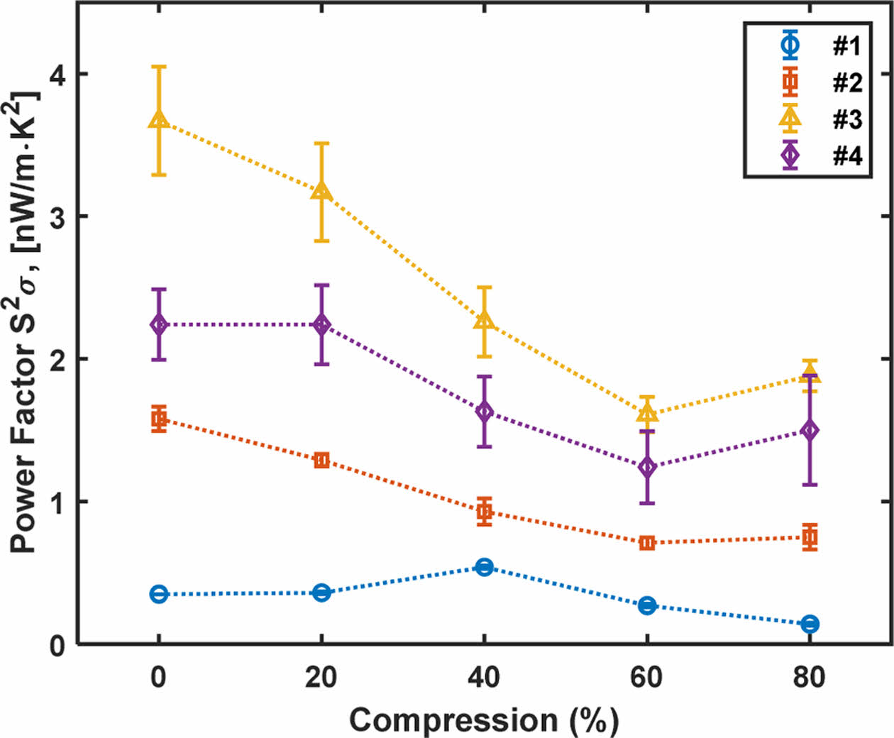 Fig. 7은 각 시편의 압축에 따른 역률을 나타낸 것이다. 제벡 계수는 시편별로 거의 일정하고, 전기전도도는 #3이 가장 높았기 때문에 #3의 역률이 가장 높은 것을 확인할 수 있었다. 또한, 제벡 계수가 거의 일정해서 역률 역시 전기전도도의 경향성과 유사한 것을 알 수 있다.