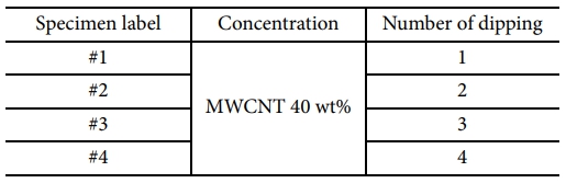 열선 커터기를 이용하여, 폴리우레탄 스펀지를 30 × 30 × 30 mm3의 크기로 절단했다. 폴리우레탄 스펀지 세척을 위해, 에탄올에 30분 동안 침지한 후 증류수로 세척하고 60oC 오븐에서 1시간 건조하여 전처리를 했다. 전처리한 스펀지는 Fig. 1과 같이 열전 잉크로 딥코팅 했다. 열전 잉크에 스펀지를 30분 동안 침지한 후, 비틀어서 물기를 제거하고 80oC 오븐에서 2시간 건조하였다. 최적의 코팅 횟수를 확인하기 위해, 딥코팅을 1~4번 반복했다. 1번 코팅한 케이스를 제외한 나머지 시편들은 마지막 건조를 100oC 오븐에서 1시간 건조했다. 즉, 3번 코팅한 시편은 첫번째와 두번째 건조는 80oC 오븐에서 2시간, 세번째 건조는 100oC 오븐에서 1시간 한 것이다. 시편 라벨은 Table 1과 같고, 물성 측정의 신뢰도 평가를 위해서 각 조건별로 3개의 시편을 만들었다.