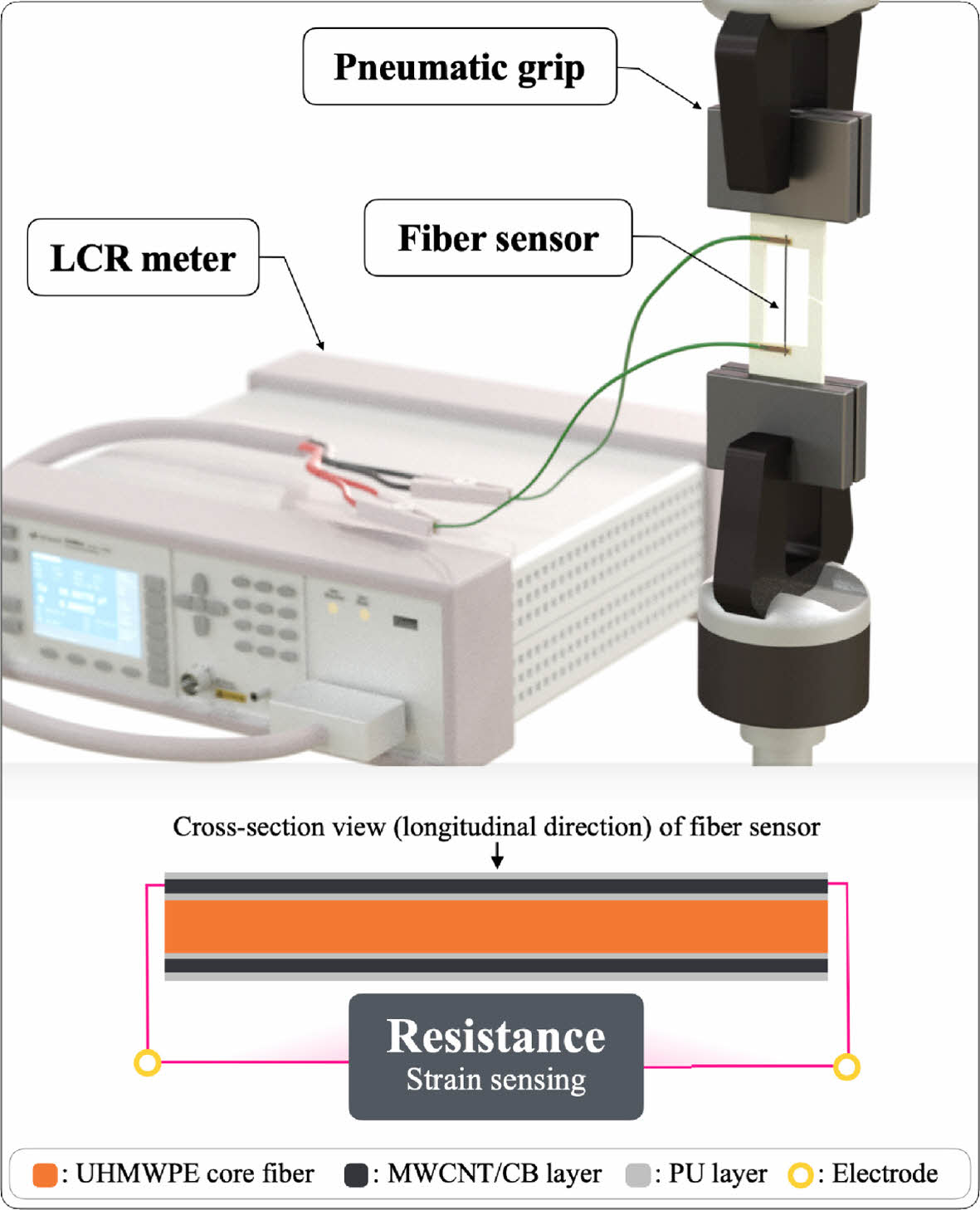 본 연구에서 개발한 섬유형 센서의 개략도는 Fig. 1과 같다. 하중을 지지하는 UHMWPE 코어 섬유의 경우, 실험실 단위의 습식 방사 장비(Lab scale wet-spinning facility)를 활용하여 Air gap gel-spinning 법으로 제조하였다. UHMWPE (5 × 106 g/mol, 대정화금) powder를 4 wt.% 농도로 방사 용액을 제조한 뒤 170oC 온도에서 0.2 MPa 압력 하에서 응고욕 (Coagulation bath)으로 토출시켜 섬유 형상으로 만들어 준 뒤, 잔존 파라핀 오일 제거를 위해 핵산(Hexane)에 24시간 동안 침지시켜 주었다. 이후 코어 섬유의 물성 향상을 위해 120oC 조건에서 13배 열연신을 진행하였고, 섬유 내부의 결정 구조 안정화 및 결정화도 향상을 위해 130oC 오븐에서 1시간 동안 열고정을 진행하였다.