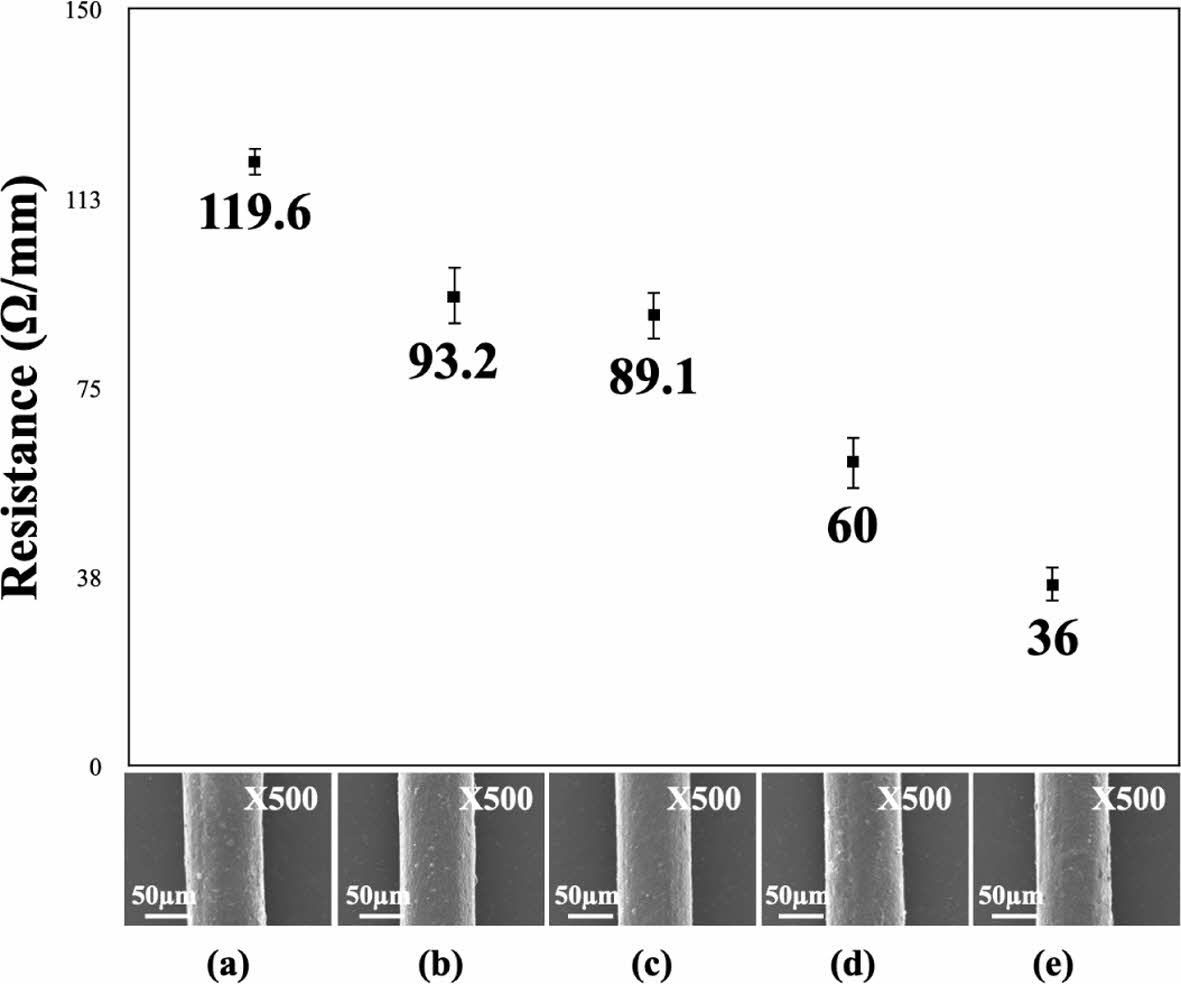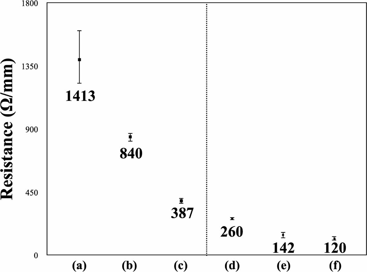이와 같은 기존 센서들의 한계를 보완하기 위해 탄소나노튜브, 그래핀과 같은 전도성 입자 기반의 나노 복합재료[5-15]를 활용하고자 하는 연구들이 많이 진행되어 왔으나, 코팅 형식 또는 전도성 입자를 고분자 소재에 혼합하여 제조 하는 나노 복합재 기반 센서의 특성상 기존 금속 소재의 센서 대비 수 kΩ 대의 높은 전기 저항을 가지는 문제가 있다. 이와 같은 나노 복합재 기반 센서의 높은 전기 저항은 구조 건전성 모니터링 시스템 구축 시 다음과 같은 문제를 야기시킨다. 센서의 높은 저항에 의해 이를 정밀하게 계측하기 위한 계측 시스템의 복잡성이 증가한다. 또한, 실제 구조 건전성 모니터링 시스템 구현 시 센서 네트워크를 구성하는 단일 센서들의 길이 제약을 야기하기 때문에 보다 넓은 영역에서 복합재의 변형 또는 미소 결함 검출 등을 위해 보다 많은 센서와 전극이 복합재 내부에 삽입되어야 한다.