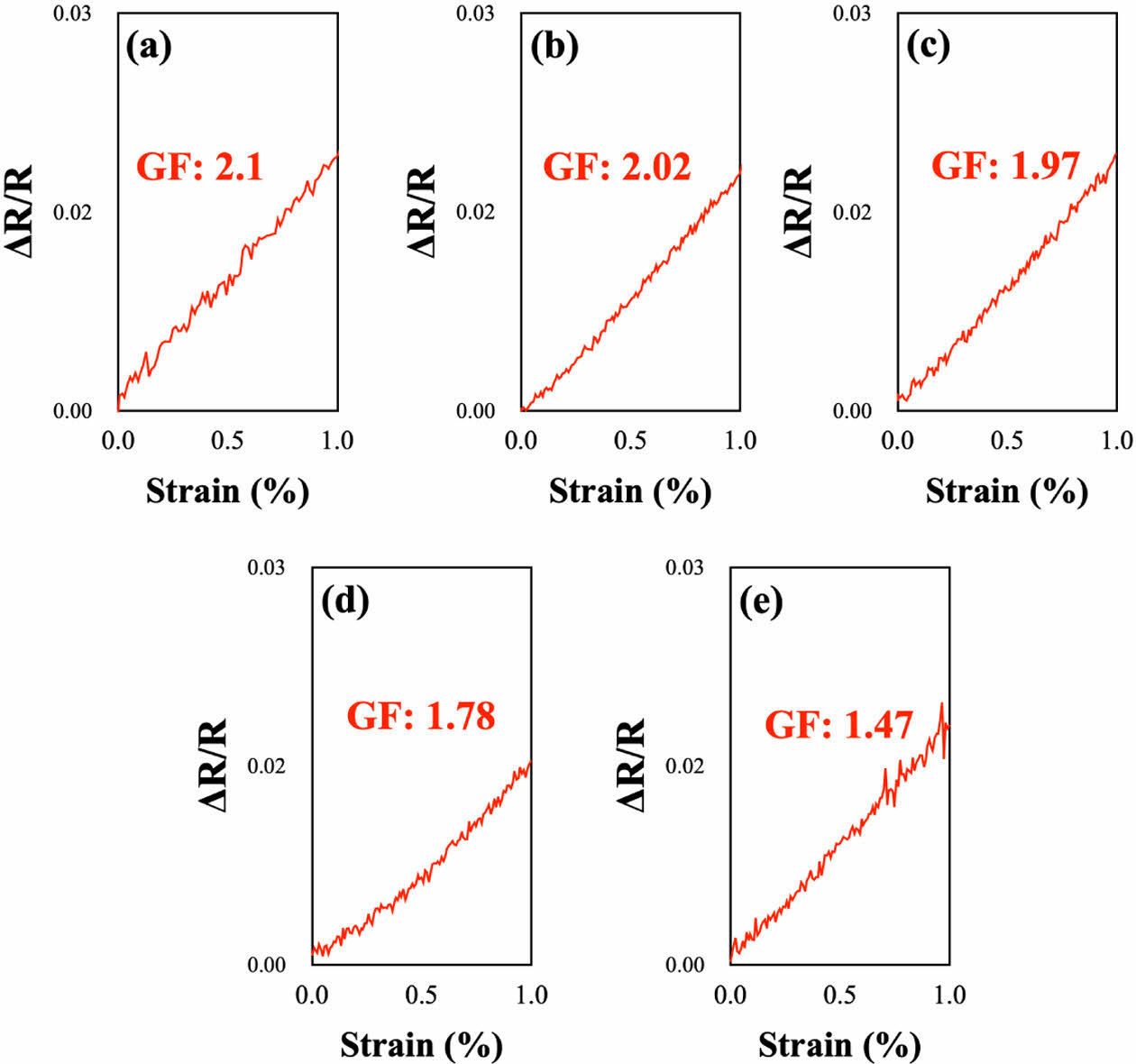 Fig. 4 Strain sensitivity of fiber sensor according to wt.% of CB; (a) 0.25 wt.%, (b) 0.5 wt.%, (c) 2 wt.%, (d) 3 wt.%, (e) 4 wt.% |