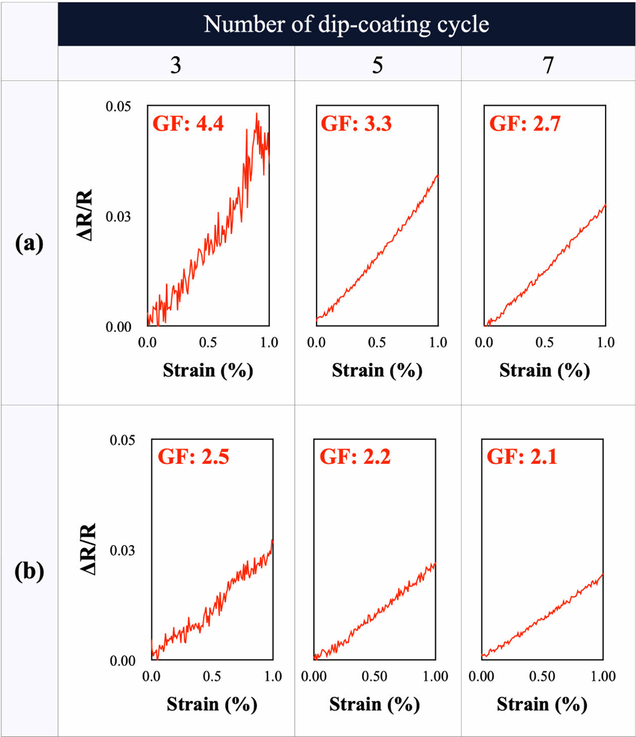 Fig. 7 Strain sensitivity of fiber sensor according to the structure of sensor fiber and number of dip-coating cycles; (a) Single PU layer structure, (b) Double PU layer structure |