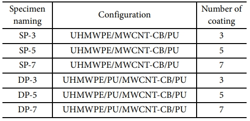 제조된 코어 섬유에 변형률 측정을 위한 MWCNT/CB hybrid filler 전기 전도층과 Encapsulation을 위한 PU 층 형성을 위해 앞서 준비한 MWCNT/CB 코팅 용액과 수분산 PU 용액(CRP 26301, T&L Co., Ltd.)를 이용해 섬유 표면을 코팅 해 주었다. 각 층은 딥코팅 법을 이용하여 형성 시켜 주었다. 시편의 구조 및 CNT/CB 전도층의 딥코팅 횟수에 맞게 코팅해 주었으며 1회 코팅 시 침지 시간은 20초로 조절하였으며 코팅 층은 80oC 오븐에서 3분간 건조시켜 주었다. 섬유형 변형률 센서의 구조와 코팅 횟수에 따른 시편 명명은 Table 1과 같다.