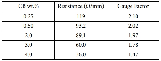 실험 결과에서 볼 수 있듯 카본 블랙의 함량이 증가할수록 민감도가 2.1에서 1.47로 점차 감소하는 것을 확인할 수 있는데, 이는 카본 블랙 함량 증가로 밀도가 높아진 전기 통로로 인해 변형이 가해졌을 때 파괴되는 전기 통로의 양이 더 적어지기 때문이라 판단된다. 즉, 전기 통로의 파괴로 인해 발생하는 전기 저항의 상승률이 카본 블랙 함량이 증가할수록 적어지기 때문에 민감도가 점차 낮아진다고 볼 수 있다. 이와 같은 결과는 Fig. 3의 저항 측정 결과와 같은 경향을 보이는데, 가장 저항이 낮았던 (가장 전기 통로의 밀도가 높은) 4 wt.%에서 가장 낮은 민감도를 보이며, 이와 반대로 가장 저항이 높았던 0.25 wt.%에서 가장 높은 민감도를 가지는 것을 알 수 있었다. Table 2는 카본 블랙 함량에 따른 전기 저항과 민감도를 정리한 표이다. 표에서 볼 수 있듯 카본 블랙 함량이 증가함에 따라 전기 저항은 크게 감소시킬 수 있으나 그에 따라서 민감도 역시 감소하기 때문에 이 중 가장 높은 민감도를 보이는 카본 블랙 0.25 wt.%를 최적의 첨가량으로 설정하였다.