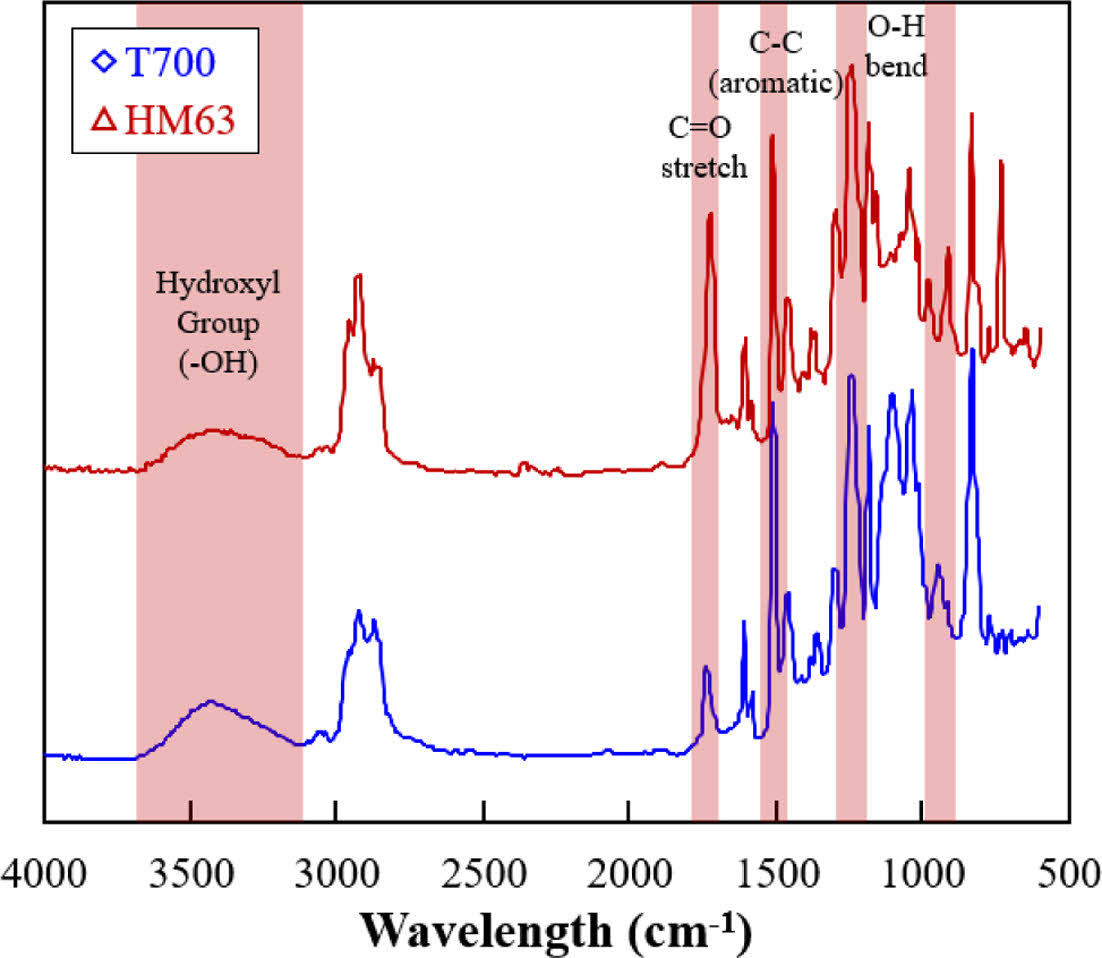 Fig. 2은 탄소섬유 표면의 화학적 상태를 분석하기 위해 FT-IR을 이용하여 사이징제를 분석한 결과를 보여준다. 탄소섬유 표면의 사이징제를 아세톤으로 추출한 후 FT-IR로 분석한 결과, T-700과 HM63 탄소섬유에 적용된 사이징제가 유사한 화학 구조를 갖고 있음을 확인하였다. 이를 통해 섬유-수지 계면 강도에서 화학적 요소의 영향은 크지 않을 것으로 예상하였다.