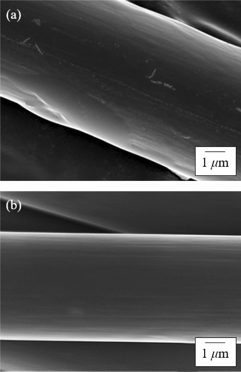 Fig. 3 Observation of carbon fiber surface with different carbon fibers: (a) T700, (b) HM63 |