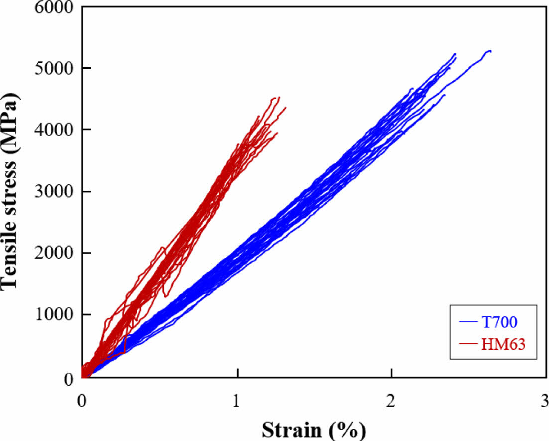 Fig. 4은 각기 다른 종류의 탄소섬유에 대한 인장강도 결과이다. T700 탄소섬유의 경우, HM63 탄소섬유보다 높은 인장강도를 나타내는 것을 확인할 수 있다. 그러나 높은 신율로 인한 낮은 강성으로 인해 구조용 복합소재의 활용에 제한사항이 있다. 이를 해결하기 위해 고강성 탄소섬유의 개발이 활발히 진행되고 있으며, 본 연구에서 활용된 HM63의 경우, 실험결과 T700 탄소섬유보다 비교적 낮은 인장강도를 나타내고 있으나, 높은 강성을 지니고 있어 구조용 복합소재로 활용 가능성이 매우 높다.