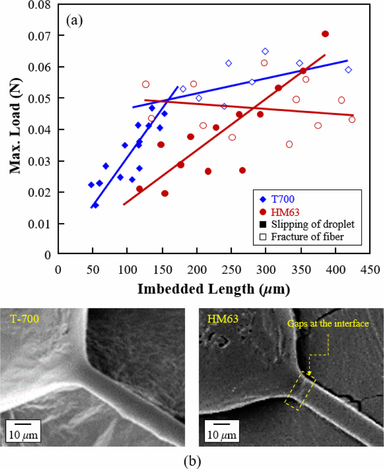 Fig. 6 Microdroplet pull-out results with different carbon fibers: (a) plot of load-imbedded length, (b) droplet photos |