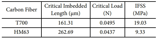Table 1은 마이크로드롭렛 인발시험을 통해 계산된 계면전단강도(Interfacial shear strength, IFSS) 결과를 보여준다. 마이크로드롭렛 인발 추세선과 섬유 파단 추세선의 교점을 기준으로 임계 하중과 임계 수지 함침 길이 값을 도출하여, 이를 통해 임계 계면 전단 강도를 계산하였다. T700의 경우, 임계 함침 길이 161.3 μm, 임계 하중 0.0495 N로 계산된 임계 계면 전단 강도는 19.03 MPa였다. 반면, HM63의 경우 임계 함침 길이가 262.7 μm로 크게 증가하였으며, 이는 수지와 섬유 간 계면 강도가 급격히 감소했음을 시사한다. 또한, 임계 하중도 0.0437 N으로 소폭 감소하였으며, 결과적으로 HM63의 임계 계면 전단 강도는 9.33 MPa로 약 50% 감소한 것을 확인하였다.