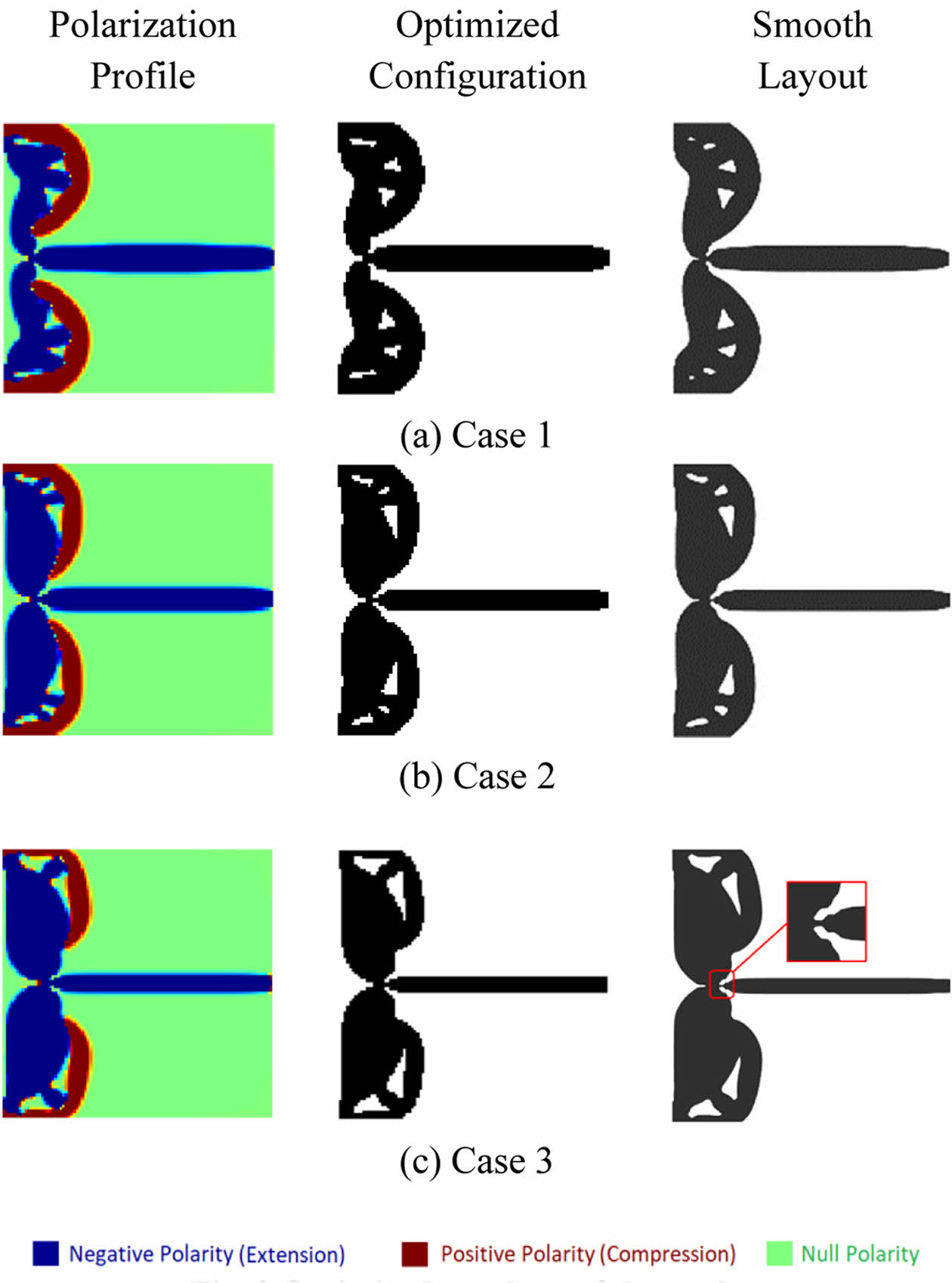 Fig. 3내 첫번째 열은 분극 프로파일을 나타낸다. 파란색, 빨간색, 초록색은 각각 음의 분극(negative polarization), 양의 분극(positive polarization), 그리고 분극이 없는 영역을 나타낸다. 두번째 열의 결과는 주어진 조건에서의 최종 구조이며, 마지막 열의 경과는 매끄러운 경계를 얻기 위한 처리를 진행한 결과이다. 여기서, 매끄럽지 않은 위상 최적화(Non-smooth TO)는 제조 가능성 제약이 없기 때문에 매끄러운 위상 최적화(Smooth TO)와 비교했을 때 성능 지표에서 더 나은 결과를 보인다.
